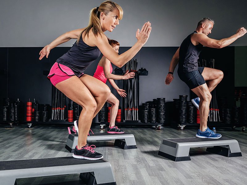 An energetic class combining stepping, cardio, and intervals. May include weights. Ends with recovery and short stretching. Simple and effective.