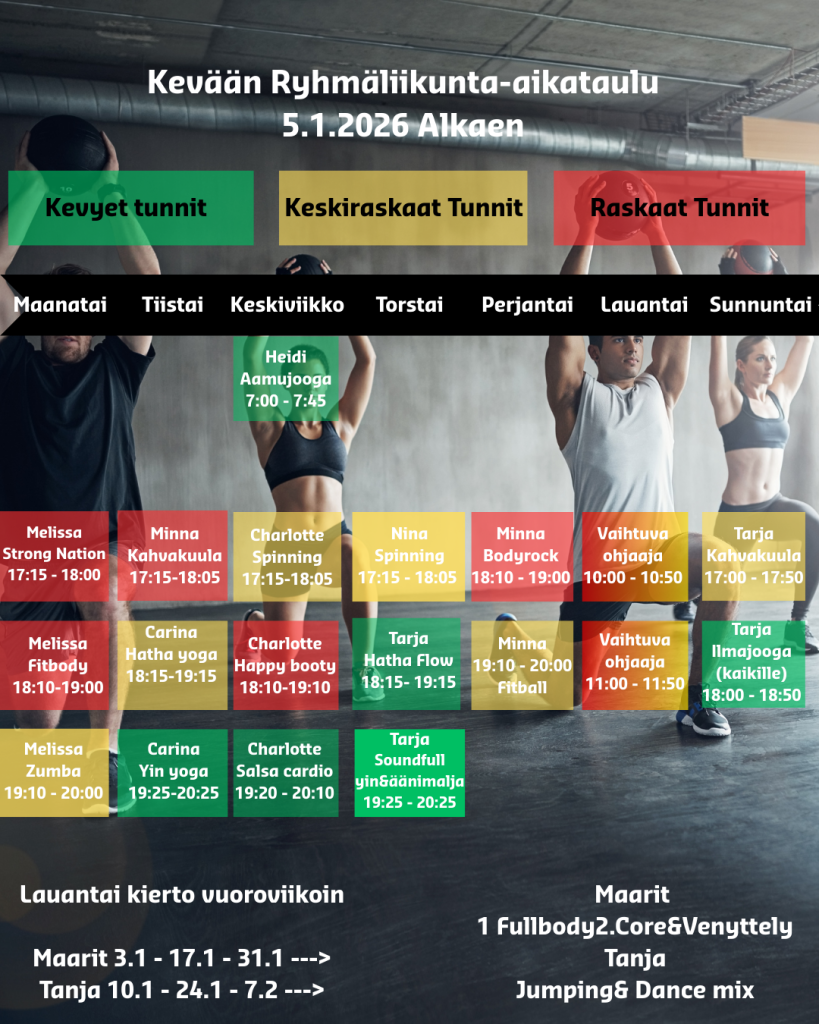 Arki- ja juhlapyhinä ei tunteja tai erikoisaikataulu, pidätämme oikeudet muutoksiin. Tarkemmat tiedot Ajankohtaista -sivulla.